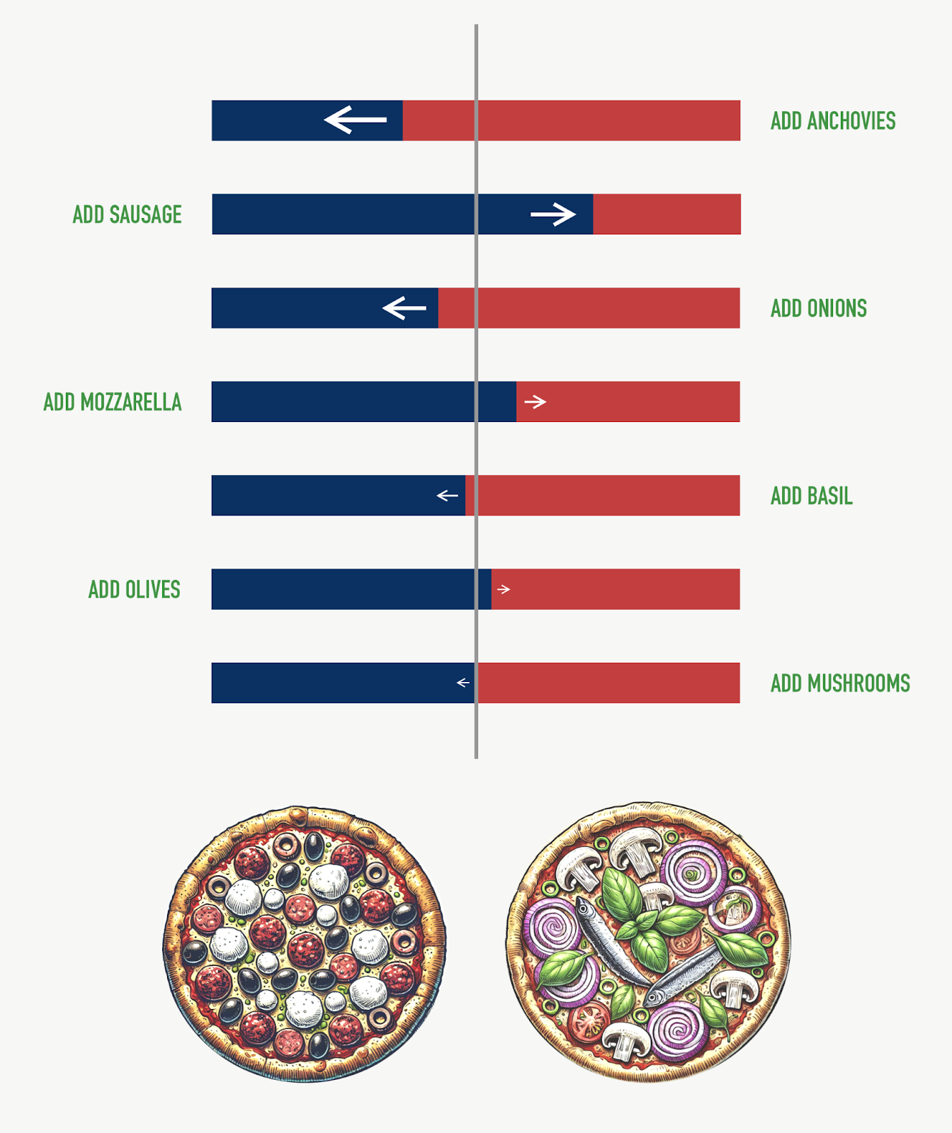 The story of Pizza Town helps explain why the sides have changed in every way but one: they continue to oppose the other. Neither side can pull ahead because there is always a topping to add or remove, which returns the game to 50-50. The more data you have, the easier it is to find these moves. In the modern world, better surveys and machines for tallying the results make the game even tighter.