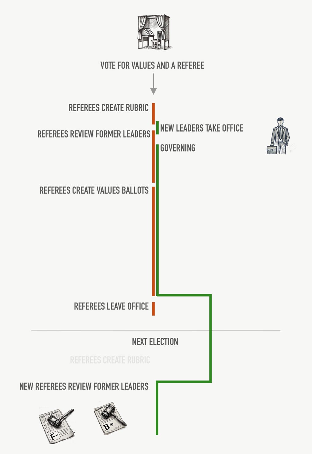 Referees translate the people’s values into specific, measurable goals for our government. They hold every leader accountable for making real progress on that mandate. Creating a body of Referees reimagines how citizens do two of their three jobs.