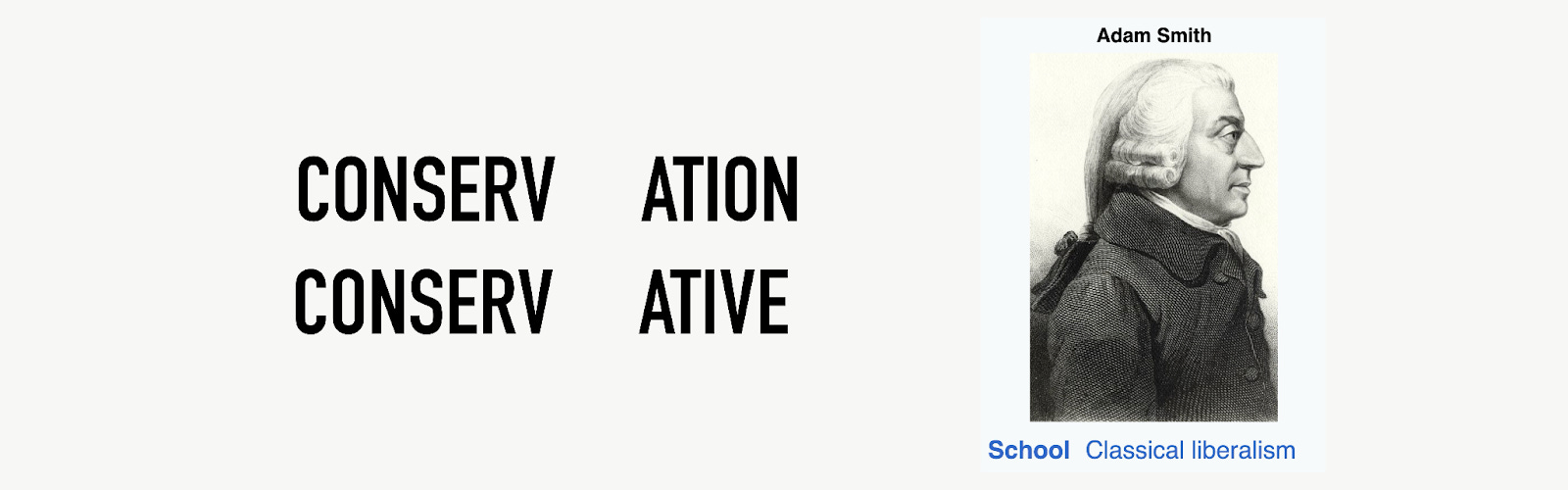 The environmental conservation crowd share their name and their philosophy towards change with the be-careful-what-you-change conservatives. And the free-market conservative crowd’s hero Adam Smith was a liberal philosopher.