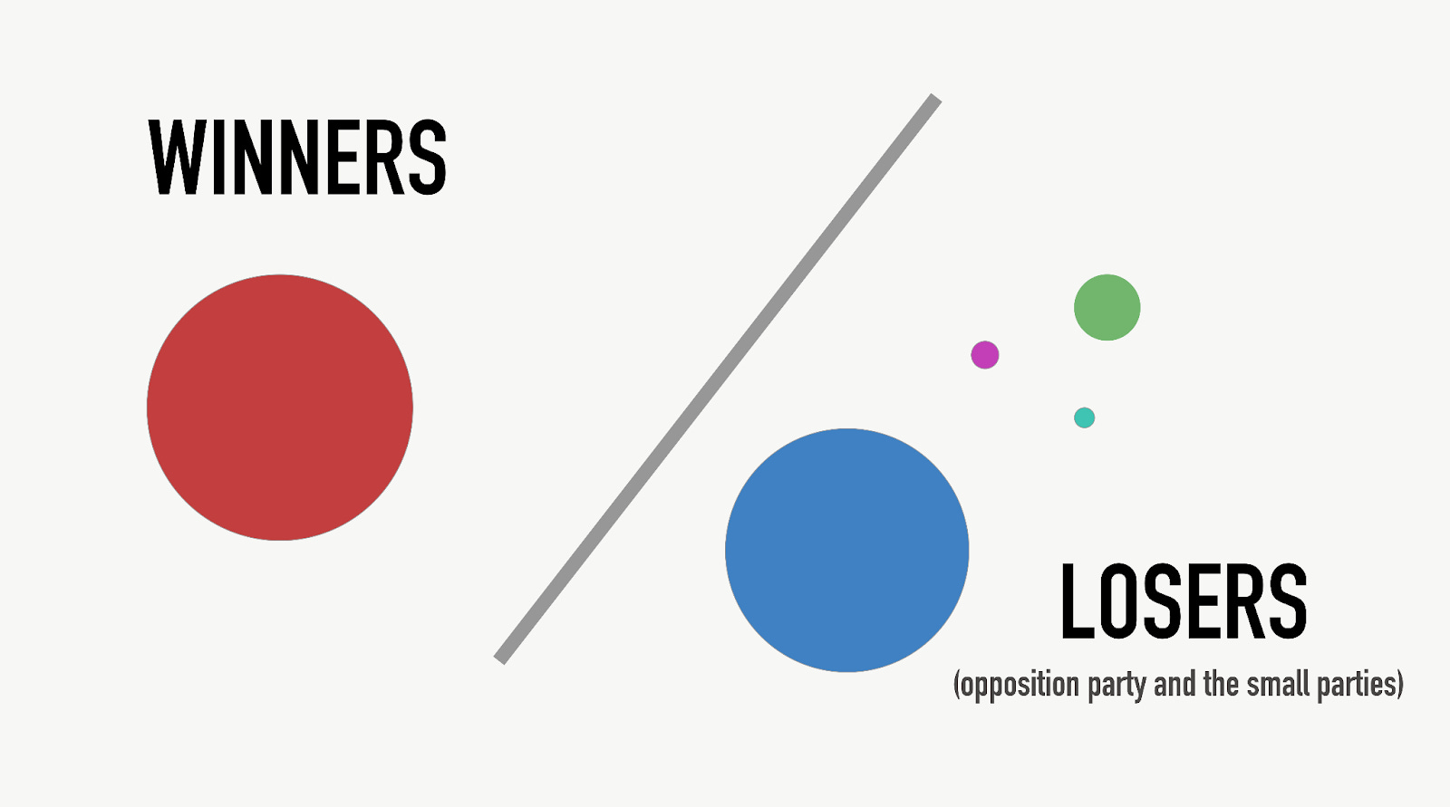 Let’s return to Duverger. How would he draw the dividing line? All he would do is write “Winners” on one side and “Losers” on the other. It can be that simple. When you give power to whomever wins the most votes, you always end up with two groups. The winning party is the one who got the most votes. The losers stand together on the other side. The biggest loser is the opposition party, but they share the losing side of the line with all the smaller parties who fielded candidates.