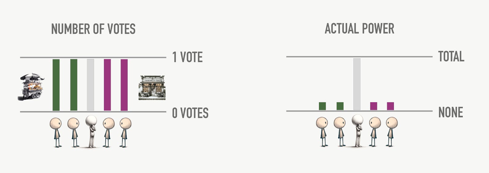 The people get to choose the Referees and set the government’s agenda. The Referees choose the actual executives who work on those goals. This puts qualified individuals into power, constrains them with clear goals, and keeps them insulated from the pressures of special interests and election cycles. Those leaders just focus on cooking good pizza and never have to leave the kitchen to ask us to re-elect them.